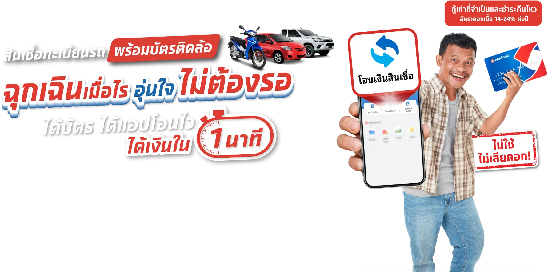 คุ้มกว่า! จัดสินเชื่อครั้งเดียว ได้วงเงินคงที่ยาวๆ 1 ปี ประหยัดกว่า! ประหยัดเวลาไม่ต้องขอสินเชื่อใหม่อุ่นใจกว่า! ฉุกเฉินเมื่อไหร่ ไม่ต้องกังวล มีบัตรเหมือนมีกระเป๋าเงินติดตัว 24 ชม. กดเงินสดได้ทันที โอนเงินสินเชื่อผ่านแอปได้ทันใจแก้ปัญหาได้ทุกสถานการณ์สนใจขอสินเชื่อที่เงินติดล้อ