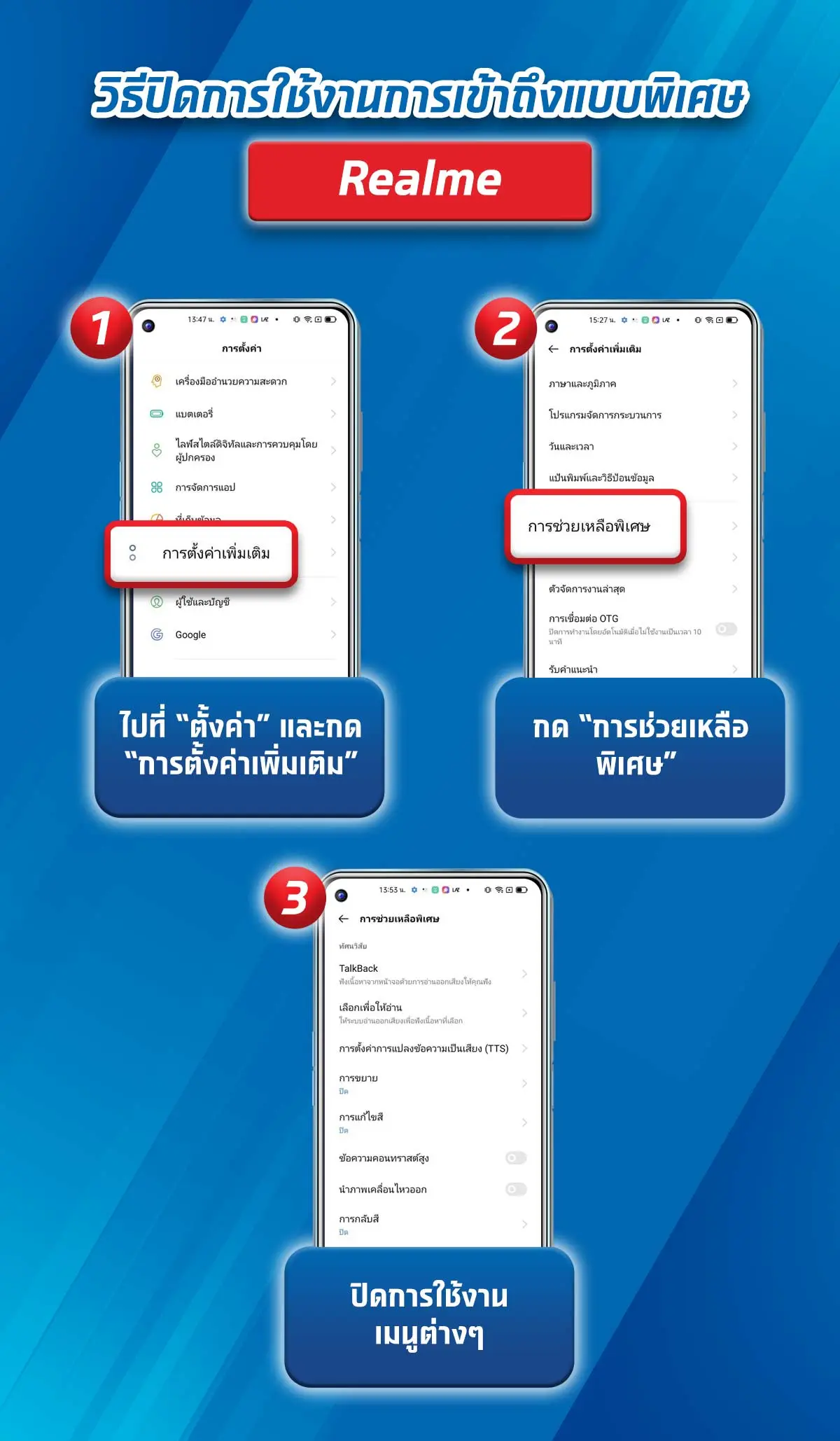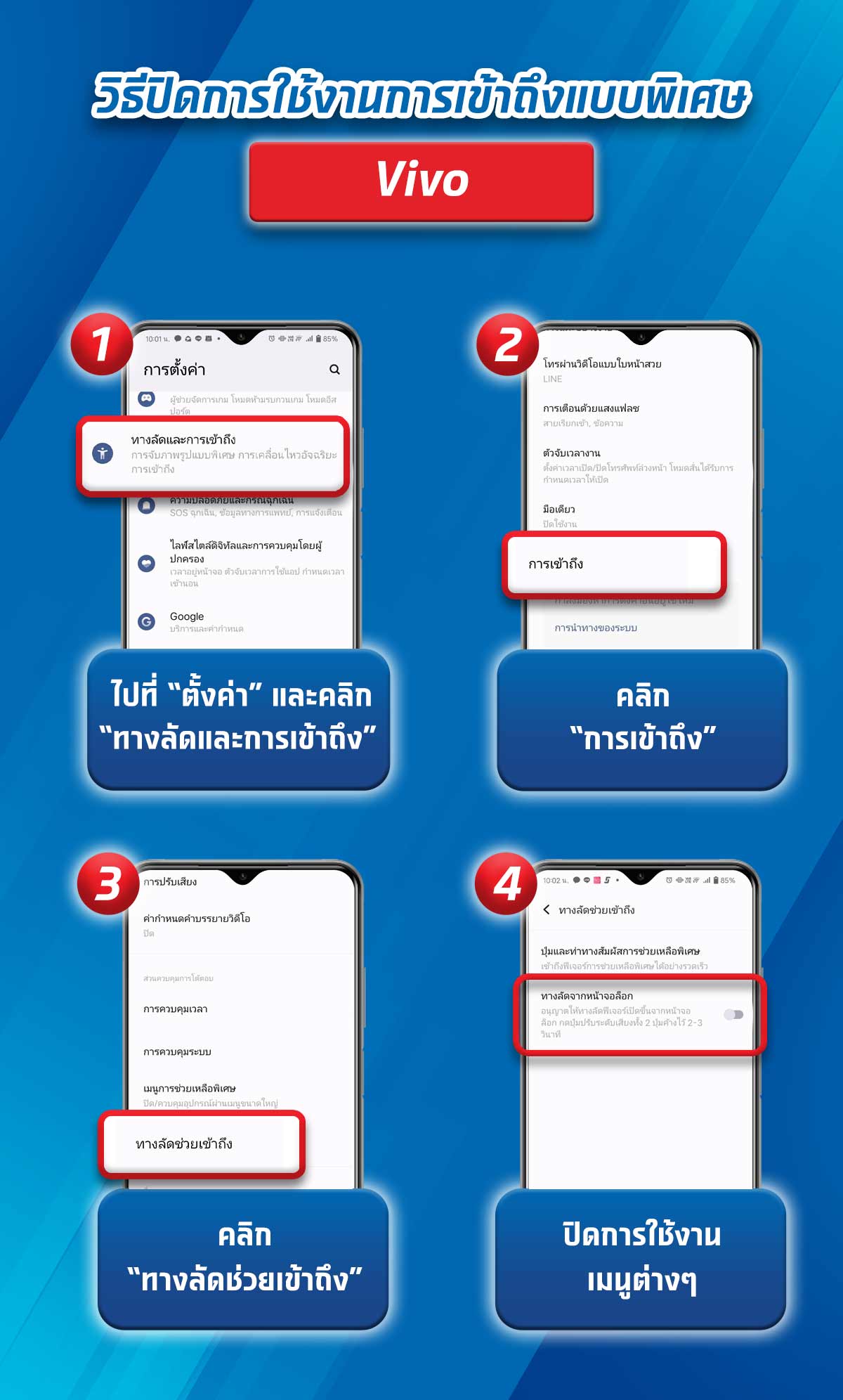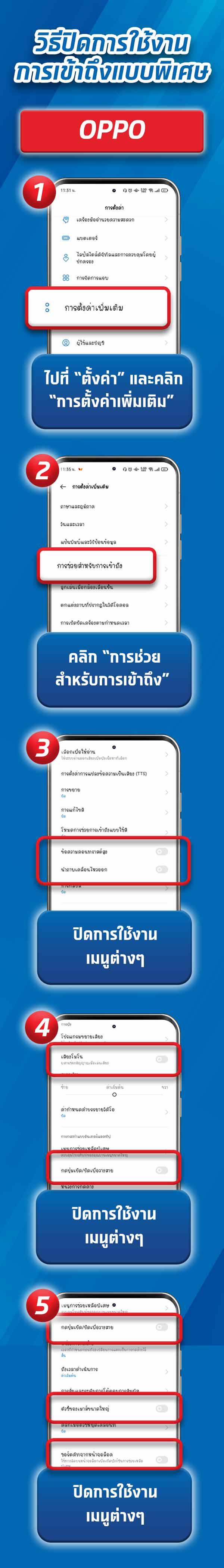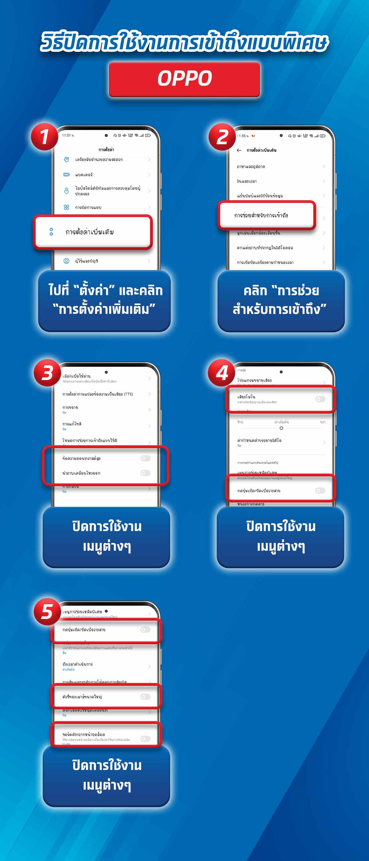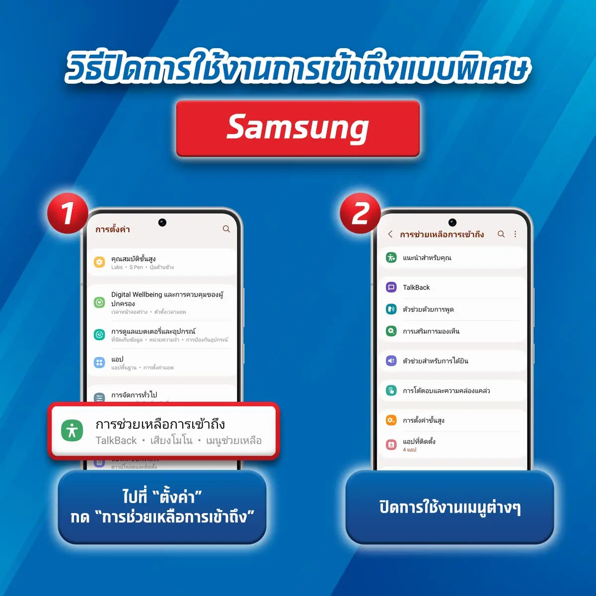 สามารถปิดการใช้งานการเข้าถึงแบบพิเศษ (Accessibility Service) สามารถดำเนินการตามขั้นตอนของแบรนด์โทรศัพท์ที่ใช้ได้ ซึ่งการตั้งค่าอาจมีความแตกต่างกันไปตามรุ่นของโทรศัพท์มือถือ ตามด้านล่างนี้