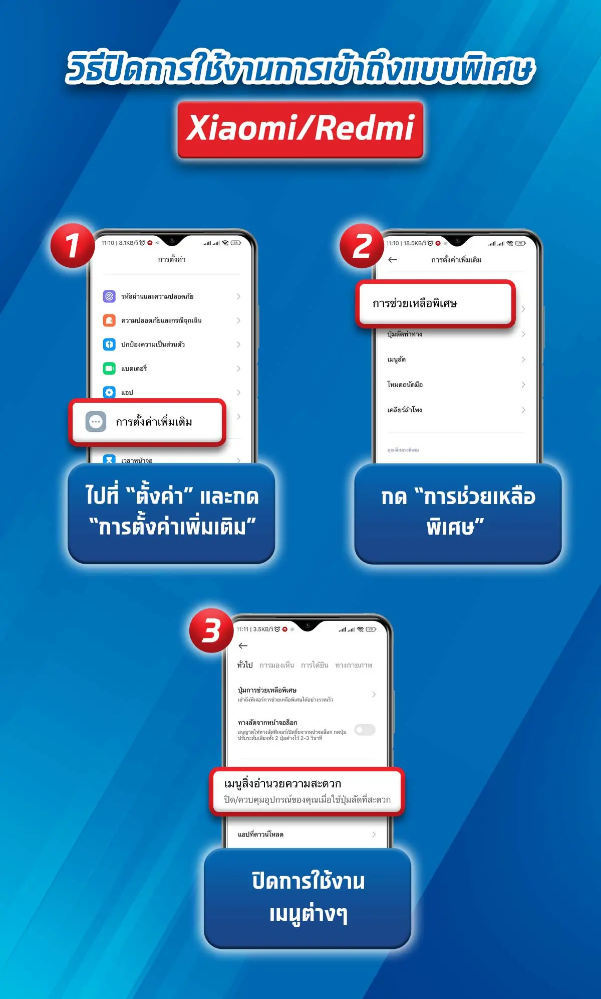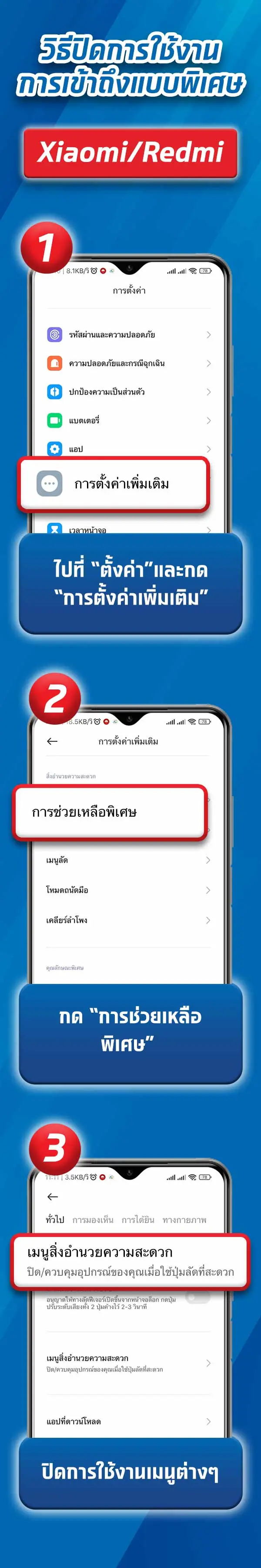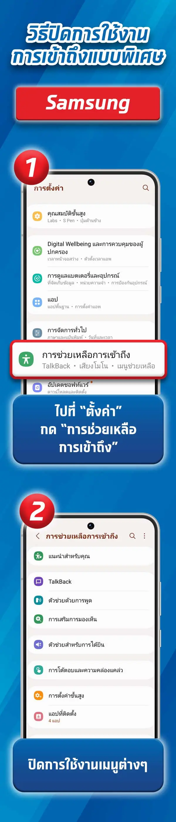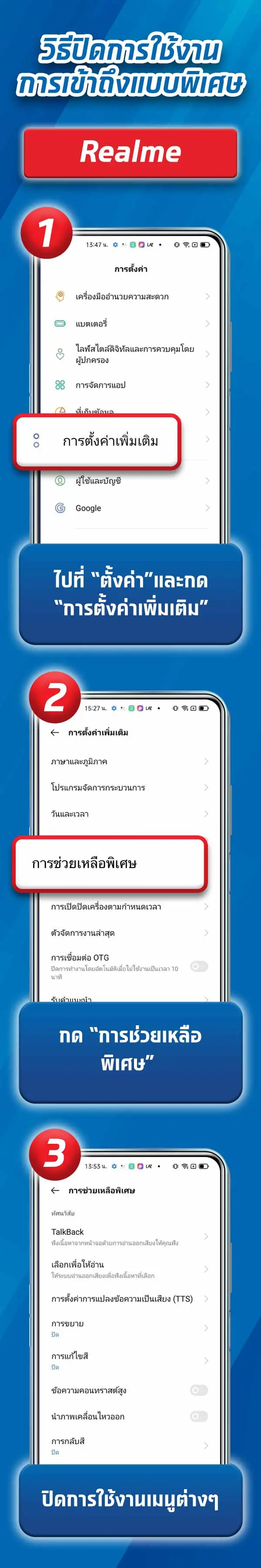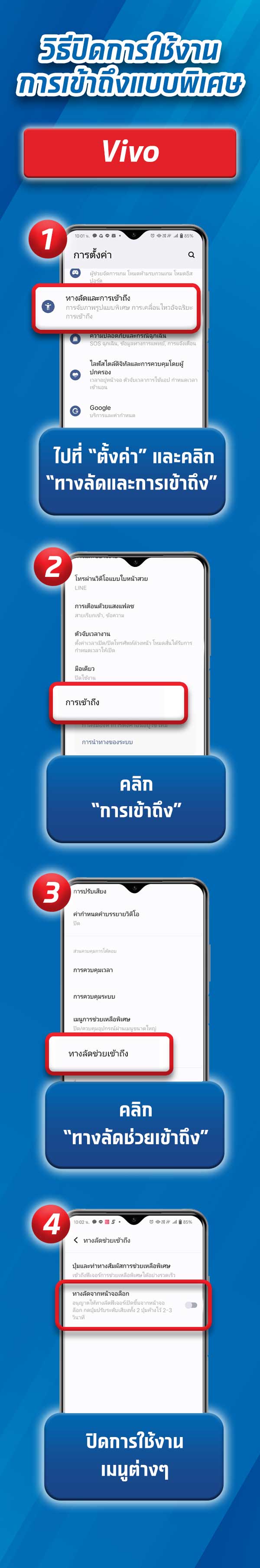สามารถปิดการใช้งานการเข้าถึงแบบพิเศษ (Accessibility Service) สามารถดำเนินการตามขั้นตอนของแบรนด์โทรศัพท์ที่ใช้ได้ ซึ่งการตั้งค่าอาจมีความแตกต่างกันไปตามรุ่นของโทรศัพท์มือถือ ตามด้านล่างนี้
