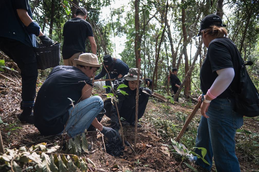 เหล่าผู้นำการเปลี่ยนแปลงได้ร่วมกันดูแลผืนป่าดอยตุงผ่านกิจกรรมเติมปุ๋ย BIOCHAR (ถ่านชีวภาพ) ซึ่งผลิตจาก “ไผ่ตายขุย” ที่หมดอายุขัยตามธรรมชาติ BIOCHAR ไม่เพียงแต่ช่วยปรับปรุงดินและเพิ่มโอกาสรอดให้ต้นไม้ แต่การนำไผ่แห้งมาแปรรูปยังช่วยลดความเสี่ยงไฟป่าและการเกิดก๊าซเรือนกระจก เพื่อสร้างระบบนิเวศที่สมบูรณ์อย่างยั่งยืน