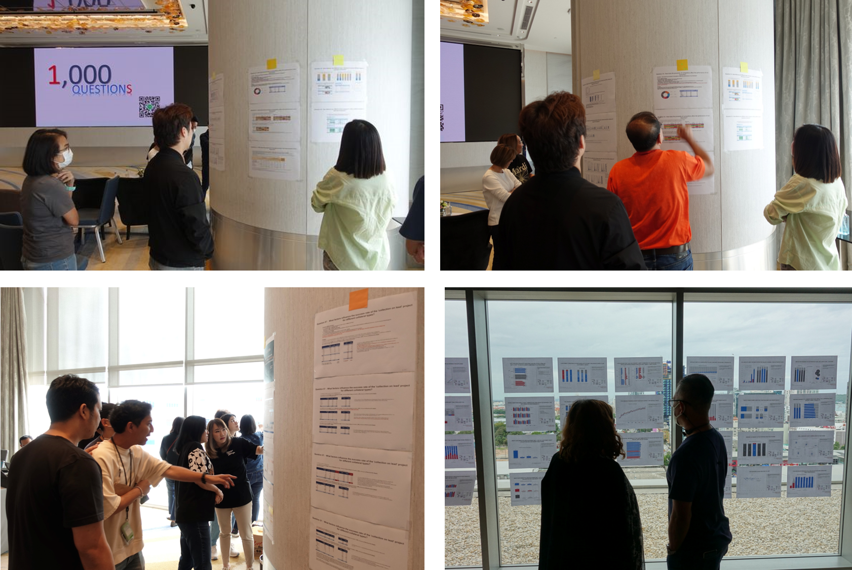 กิจกรรมแรกของเวิร์กชอป 1,000 คำถามคือ Gallery Walk ซึ่งเปิดโอกาสให้ผู้นำชาวเงินติดล้อได้เห็น ‘การบ้านเดี่ยว’ ของคนที่ทำมาได้ถูกต้อง ซึ่งจุดประสงค์ที่แท้จริงของการบ้านนี้ ไม่ได้มุ่งเน้นที่คำตอบ แต่เน้นให้เห็นที่มาว่า ก่อนจะมาเป็นข้อมูลที่สามารถนำไปวิเคราะห์ได้นั้น จะต้องผ่านกระบวนการหลายอย่าง ตั้งแต่เก็บรวมรวมข้อมูล จัดเตรียม ทำความสะอาดข้อมูล (Data Cleansing) ไปจนถึงนำข้อมูลมาเชื่อมโยง จนได้บทวิเคราะห์เชิงลึกที่สามารถนำไปต่อยอดปฏิบัติได้จริง
