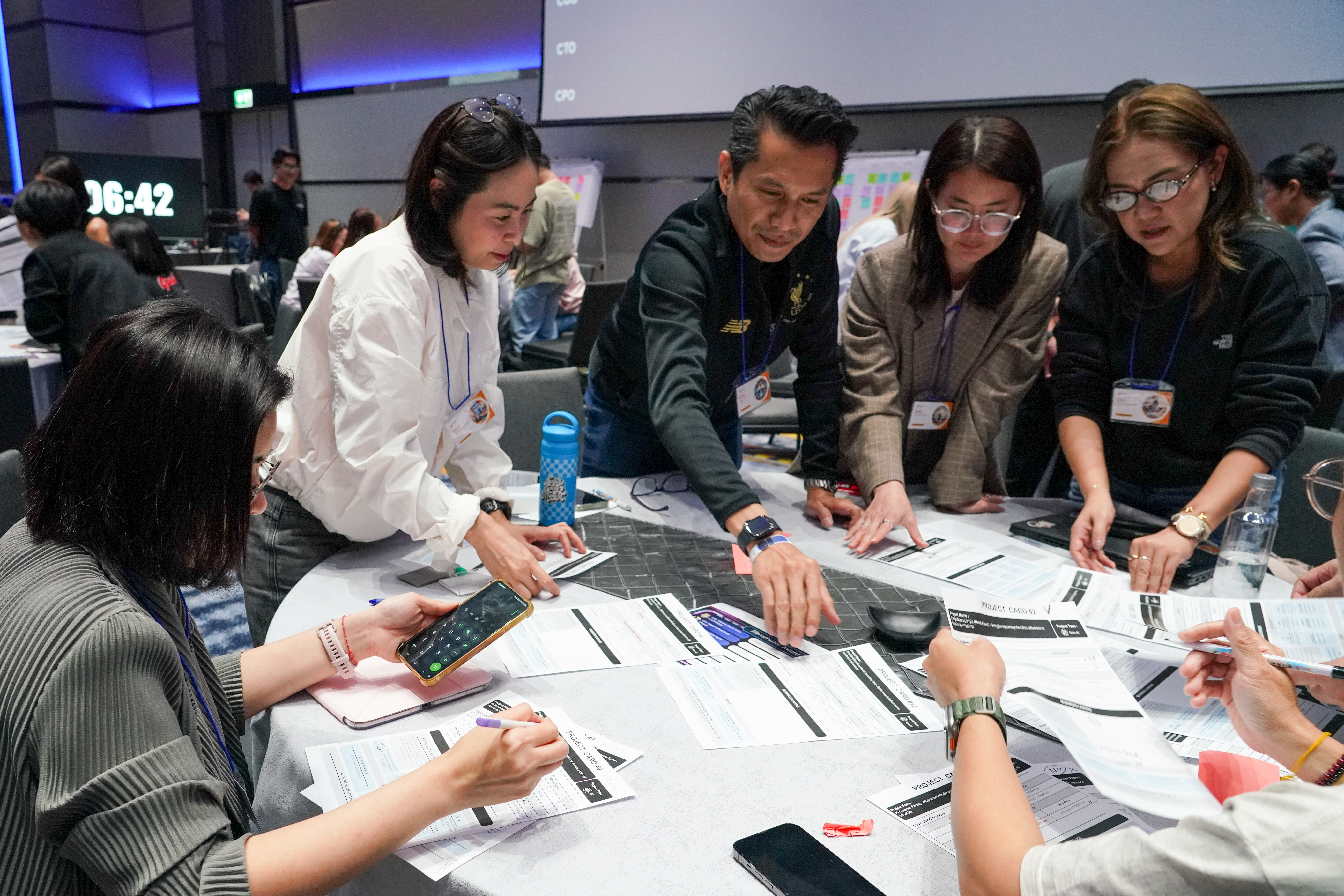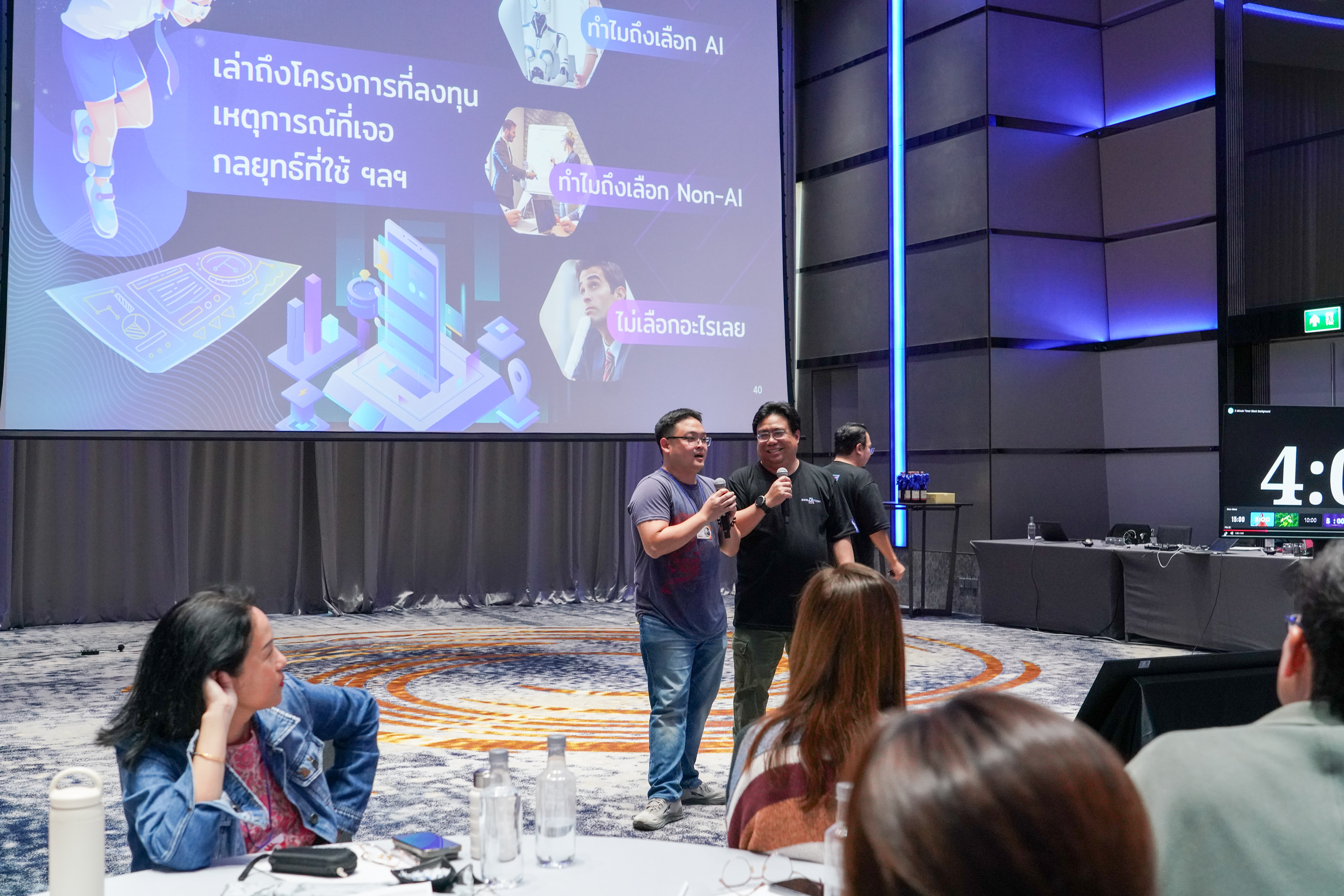 นอกจากนี้ยังมีกิจกรรม Business Matching Game ซึ่งเป็น Simulation Workshop ที่ออกแบบโดย คุณนอร์ธ ธีวินท์ จิตรสถาพร ผู้อำนวยการอาวุโส ฝ่ายวิเคราะห์และพัฒนา เรียกว่าเป็นเกมที่ทั้งตอบโจทย์และโดนใจเหล่าผู้บริหารที่มาเข้าร่วมเวิร์กช็อปครั้งนี้ได้เป็นอย่างดี ซึ่งทำให้ผู้เข้าร่วมได้ทดลองวางกลยุทธ์ AI ผ่านสถานการณ์จำลองแบบแข่งขัน ช่วยให้เข้าใจมากขึ้นว่าแต่ละ Use Case ควรถูกเลือกและใช้เมื่อไหร่ในบริบทธุรกิจจริง